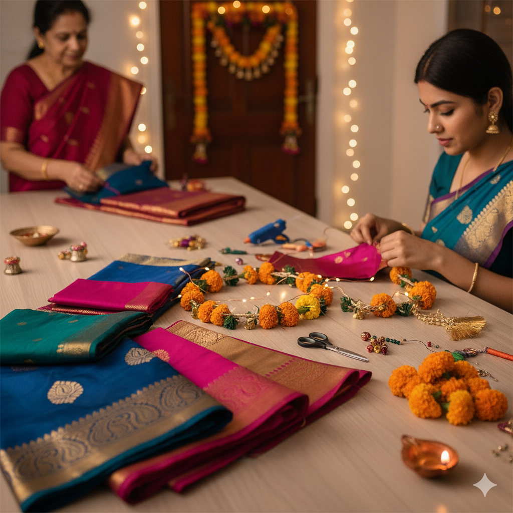 - Theme-Based Toran: Choose saree colors to match your Diwali theme—gold and red for traditional, or pastel shades for a modern touch.